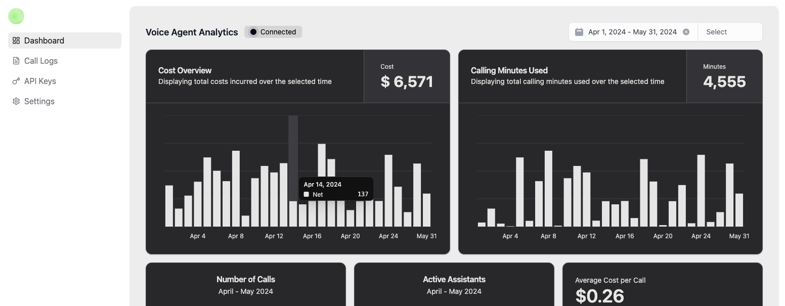 Gain full control over call logs, transcripts, and audio. Optimize voice agent performance with real-time insights